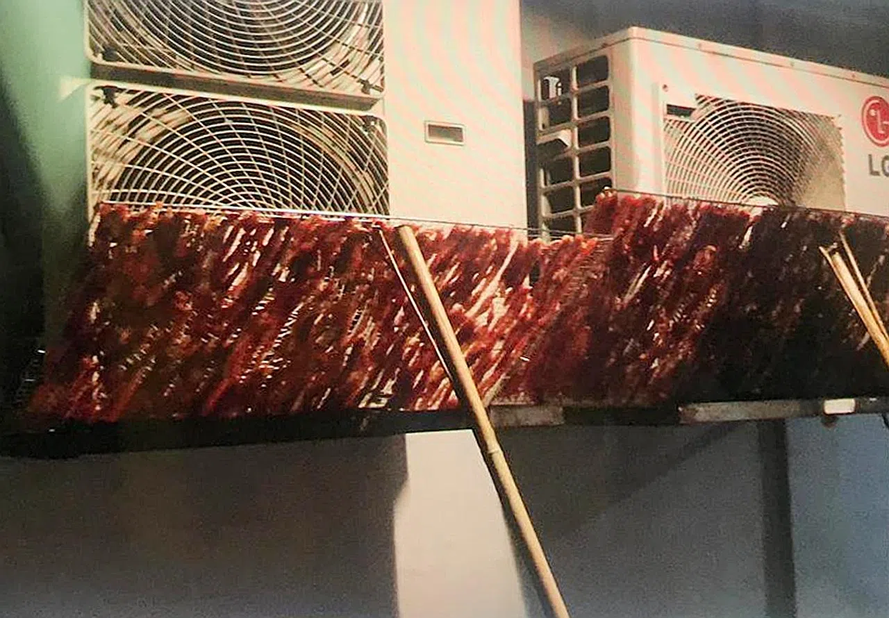 It was a sight to behold: Racks of red, raw meat hanging outdoors to dry in the heat of dusty air-conditioner compressor vents along a second-storey HDB corridor in Beach Road.