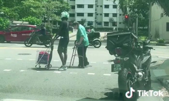In the 86-second video posted by TikTok user Akasha on Friday (Aug 25), a man wearing a motorcycle helmet is standing next to a parked motorcycle and an elderly woman at a corner at the junction of Kim Pong Road and Tiong Bahru Road.