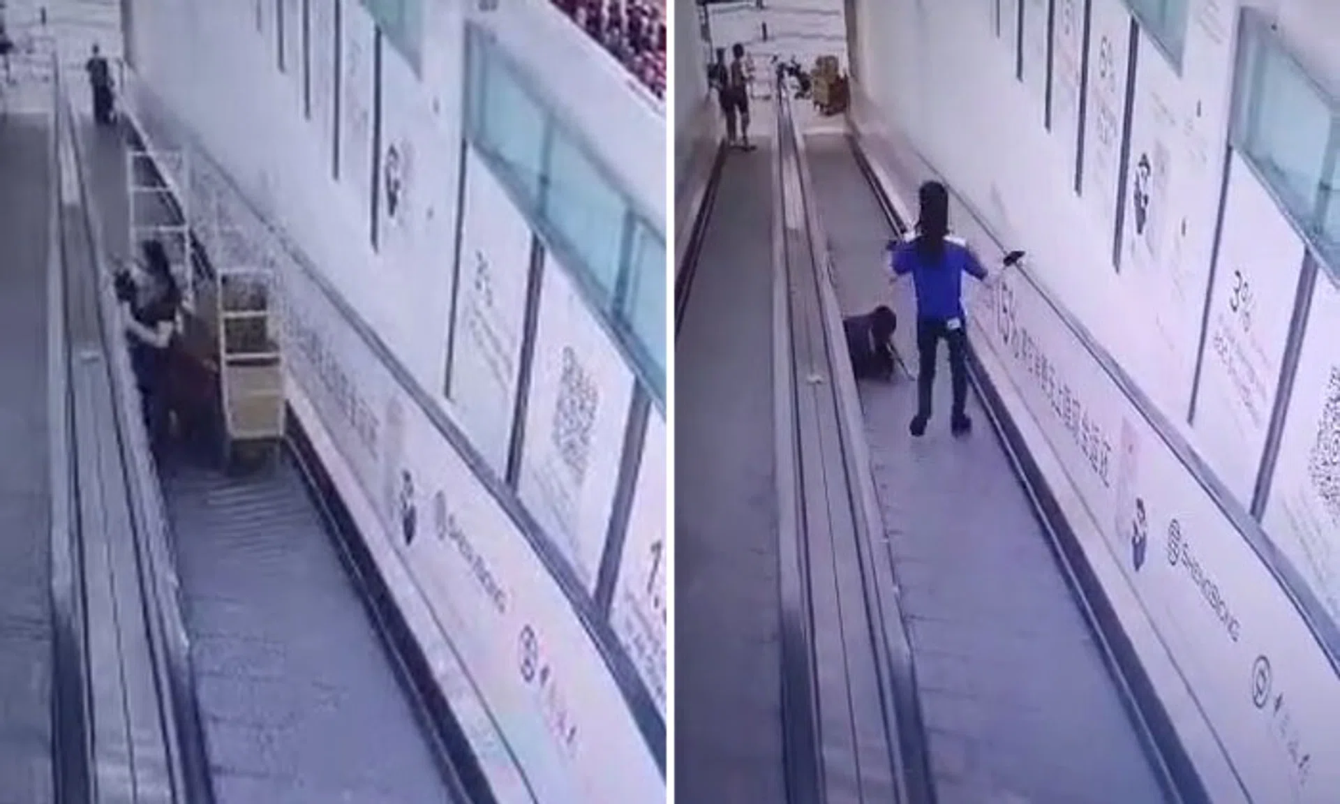 In another video, the employee is seen unloading items from the cart when it rolls away just moments after the first woman boarded the travelator.