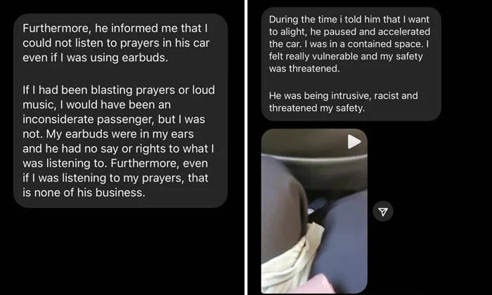 In the video, the driver could be heard telling the woman not to listen to prayers because "the environment, the energy all change (sic)".