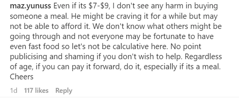 In the comments, many felt it was unnecessary for the student to "warn others" and "shame" the man. They also said there was nothing wrong in helping the man out with a free meal.