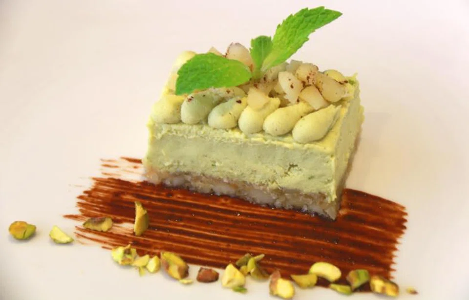 Avocado Lime Mousse atop a macadamia nut crust with dates. Garnished with pistachios. TNP Photo: Christabel Chiang
