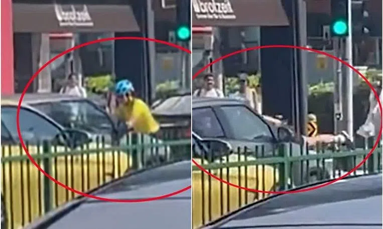 The car is then seen moving towards i12 Katong Mall, with the cyclist clinging on to the car as her shouts are heard in the distance.