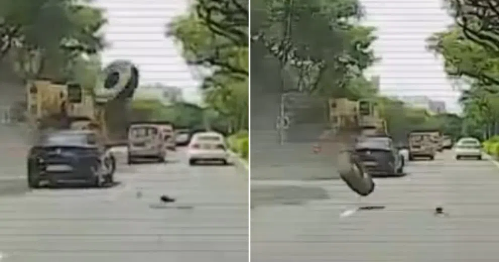 A tyre fell from a heavy vehicle and hit a car along the Pan Island Expressway (PIE) on Saturday (Nov 27) at about 1.42pm.