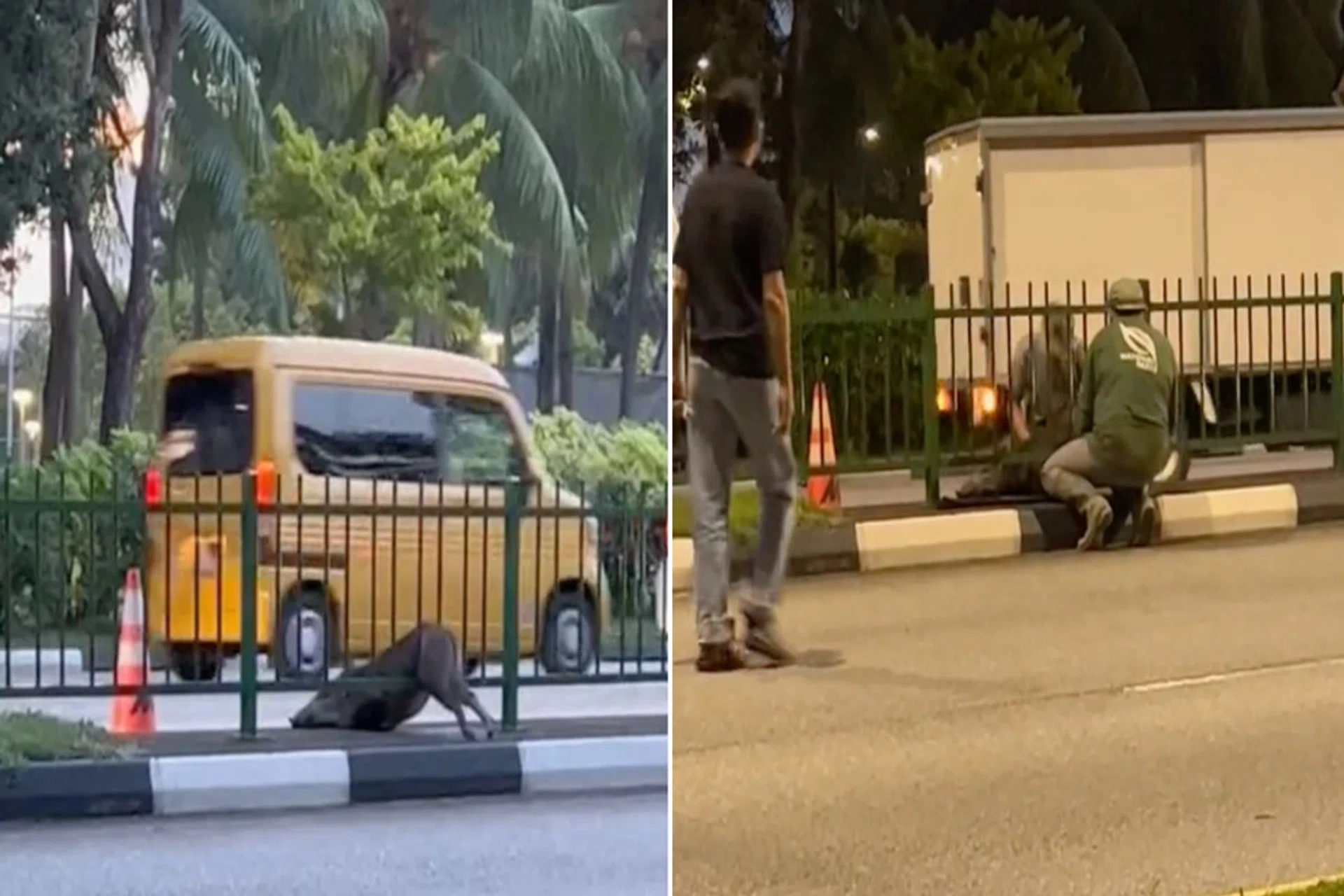 NParks personnel rescued a wild boar that got stuck between the bars of a road divider in Sengkang on Wednesday (Sept 21).