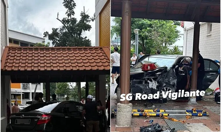 Photos of the aftermath posted on the SG Road Vigilante Facebook page show that a Malaysia-registered black Perodua Bezza had crashed into a pillar of the shelter. The impact caused the front left side of the car to be badly damaged.