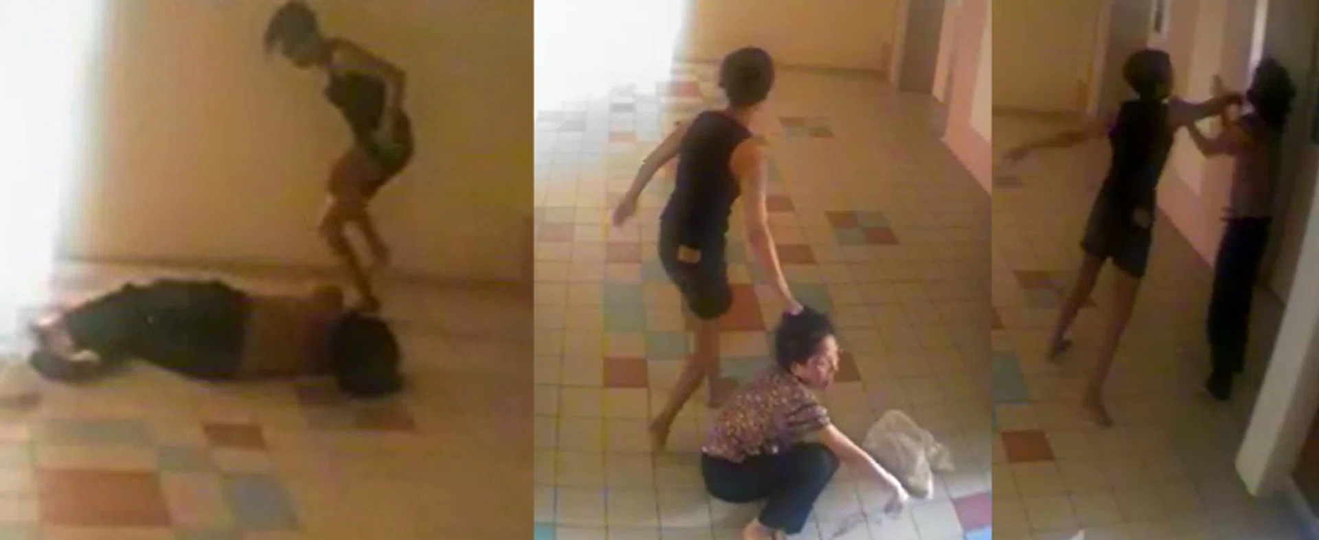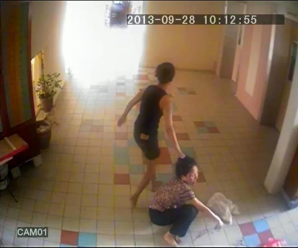 After Ng stops, Madam Toh manages to get up. But as she walks away, Ng approaches her again and slaps her face several times. She then grabs her hair, throws her to the ground and scolds her.