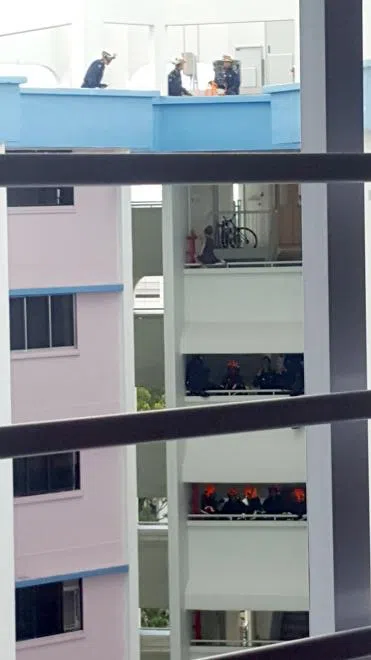 The SCDF arrived at the scene at 2.35pm and soon, a life pack was set up at the foot of the block to cushion any fall.