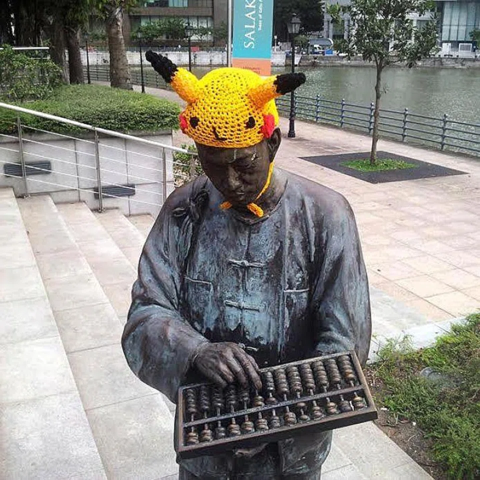 She went on to yarnbomb several statues, including adding Pikachu caps to the bronze figures along the Singapore River in April 2013.