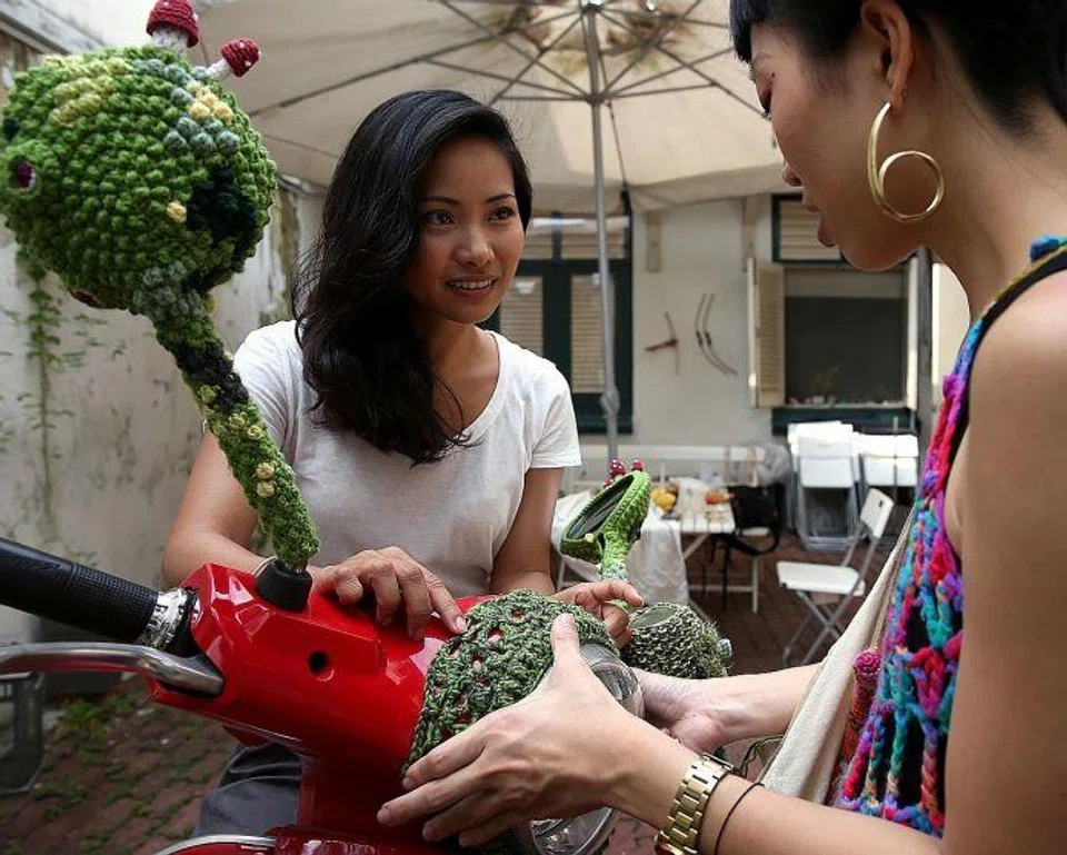 In January, she posted some yarnbombing ideas on her Facebook page. Art lecturer Lucinda Law, 38, contacted her within hours and Ms Lim agreed to undertake her current project: yarnbombing Ms Law's Vespa scooter.