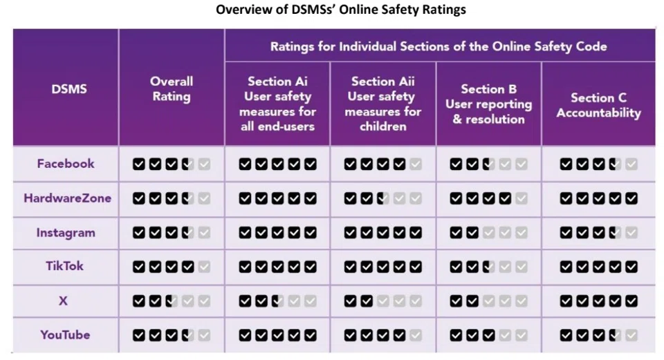 Each platform was rated in areas such as accountability as well as user reporting and resolution based on Singapore-specific data submitted in the online safety reports.