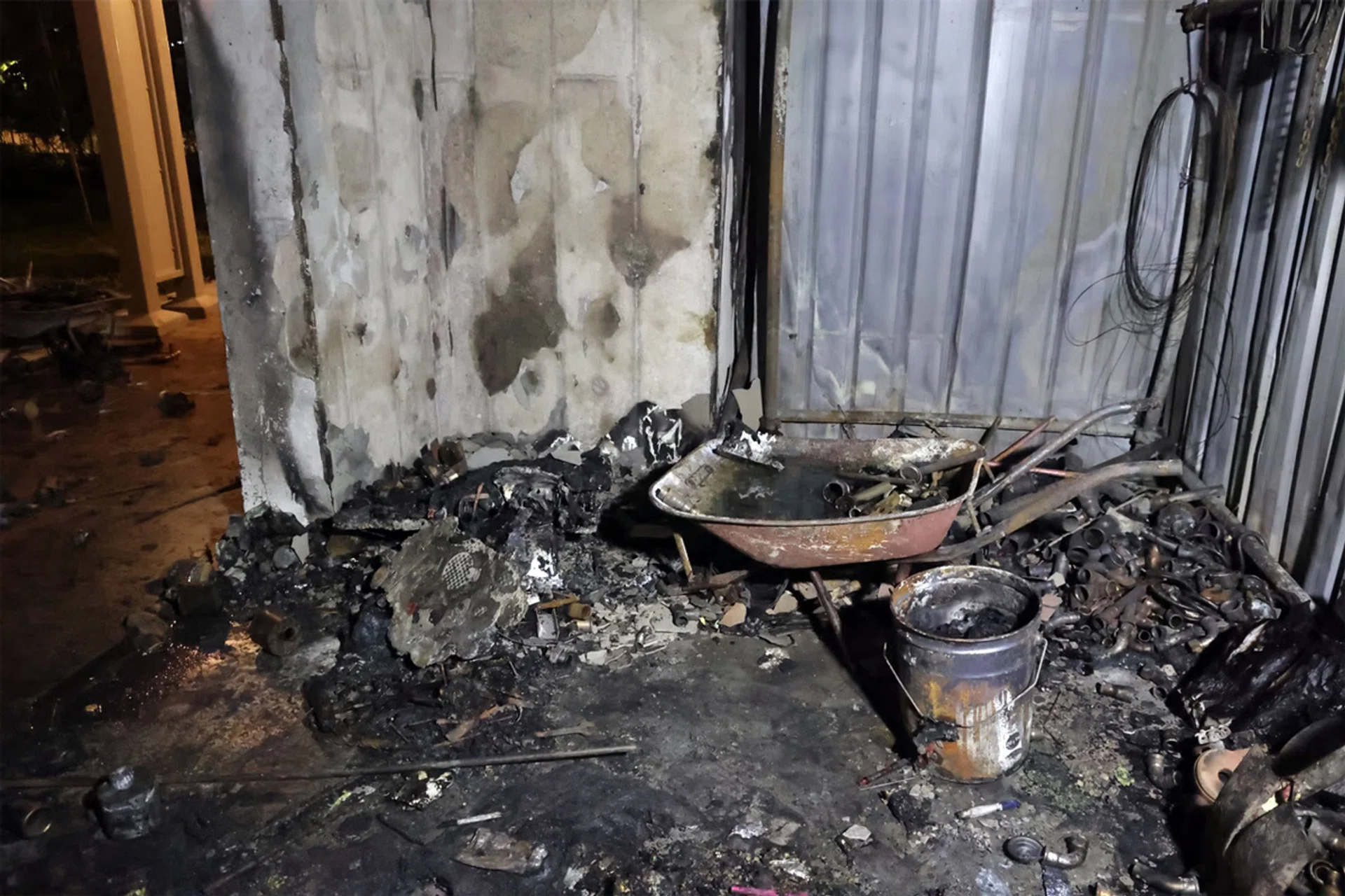 Upon inspection, the storage area was found to have contained various building materials, such as pipes and tiles. The area was charred, with ceiling lights melted and building materials on the floor deformed by the intense heat.