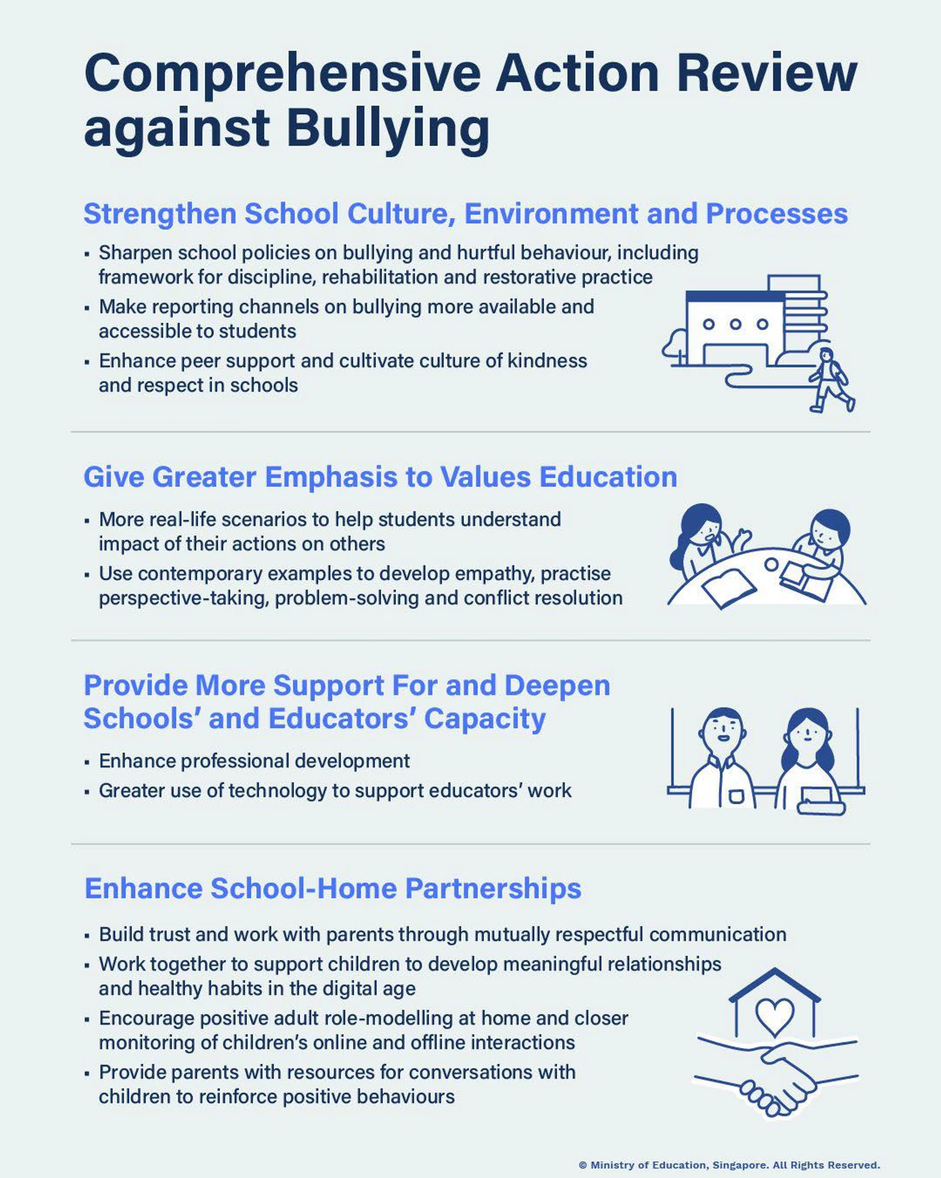 According to The Straits Times, Mr Lee outlined four key areas that the ministry will focus on: strengthening school culture and processes, focusing more on values education for students, supporting educators, and improving schools' partnerships with parents.