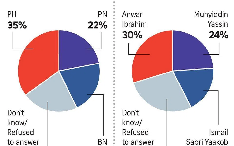 The latest survey by Merdeka Center for Opinion Research conducted from Nov 5 to 8 found that PH is the preferred coalition to run the federal government among slightly over one-third of West Malaysians, and that Mr Anwar is also the preferred choice for prime minister.