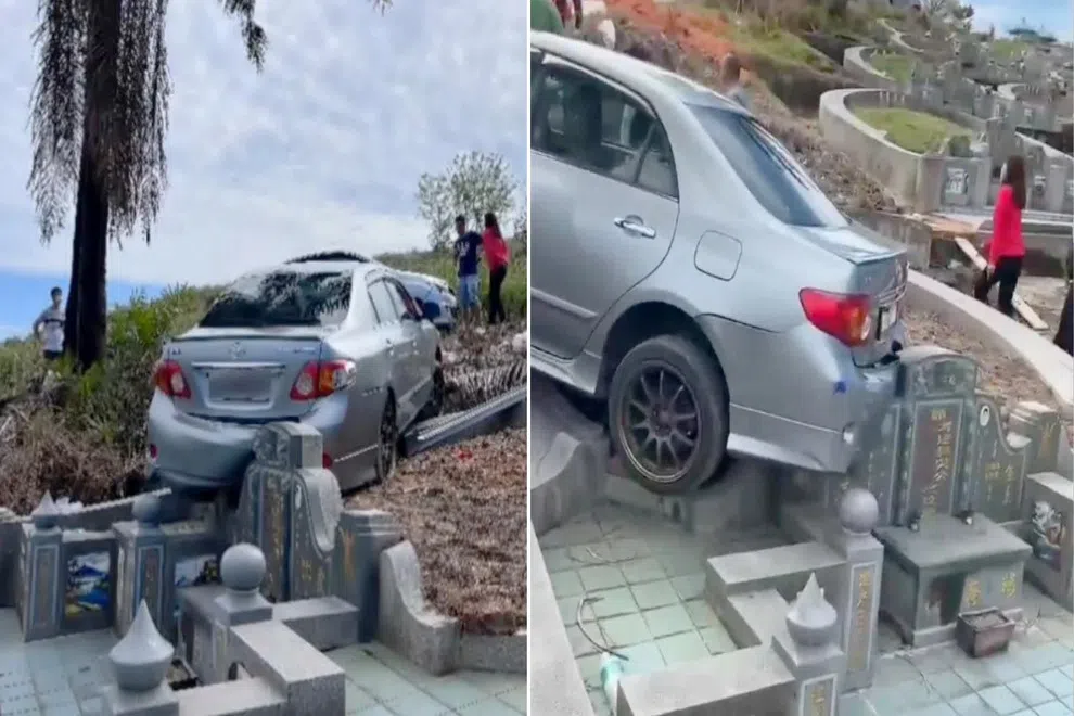 A driver accidentally reversed into a gravestone at a Chinese cemetery in Perak, Malaysia, on Sunday (March 26).