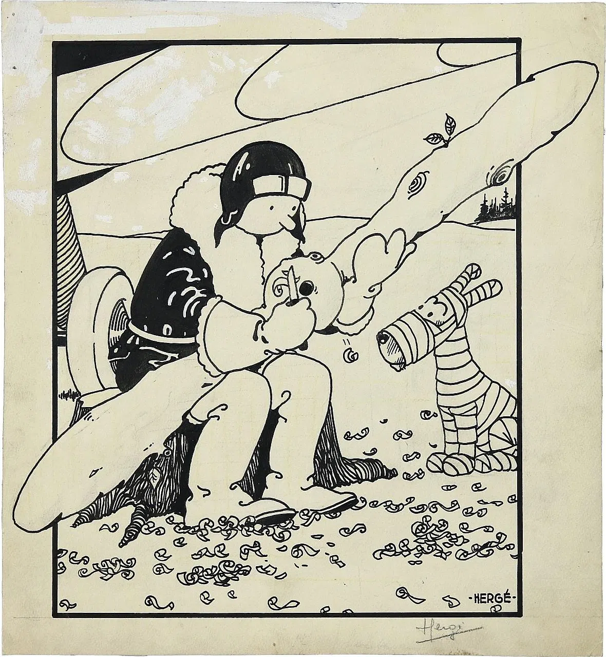 The illustration, by Tintin creator Herge (the pseudonym of Belgian cartoonist Georges Remi, who died in 1983), shows the young reporter sitting on a tree stump carving a makeshift propeller for his plane. His dog, Snowy, sits and watches.