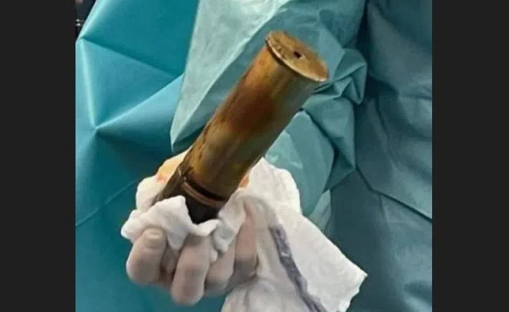 The 20cm-long and 5cm-wide shell was surgically removed. But not before the bomb squad was called in and parts of the hospital were evacuated as a precaution.