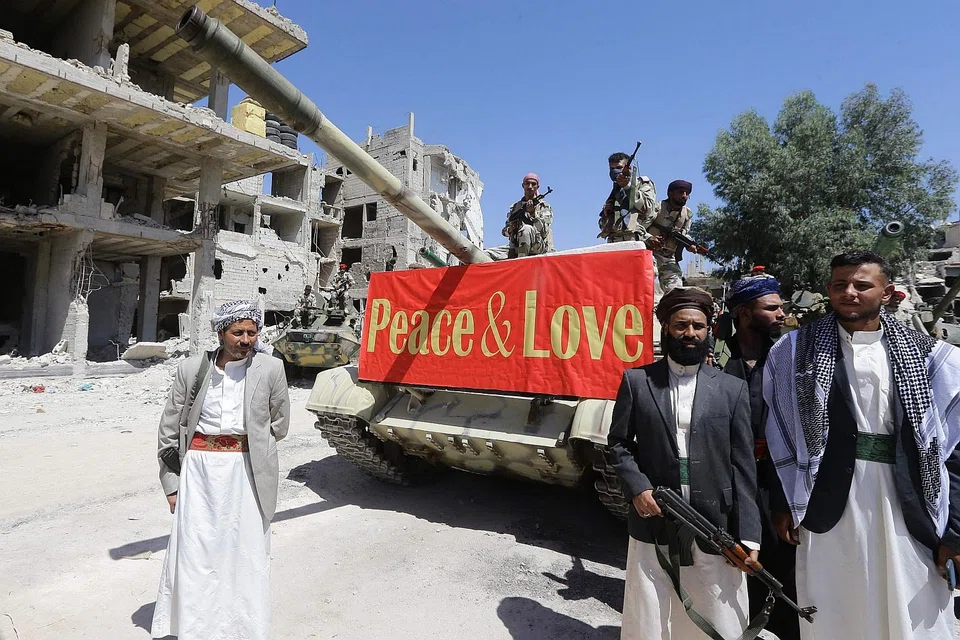 A red banner in three languages was unfurled for the small ceremony and another that read "Peace & Love" was propped up on the front of a tank.