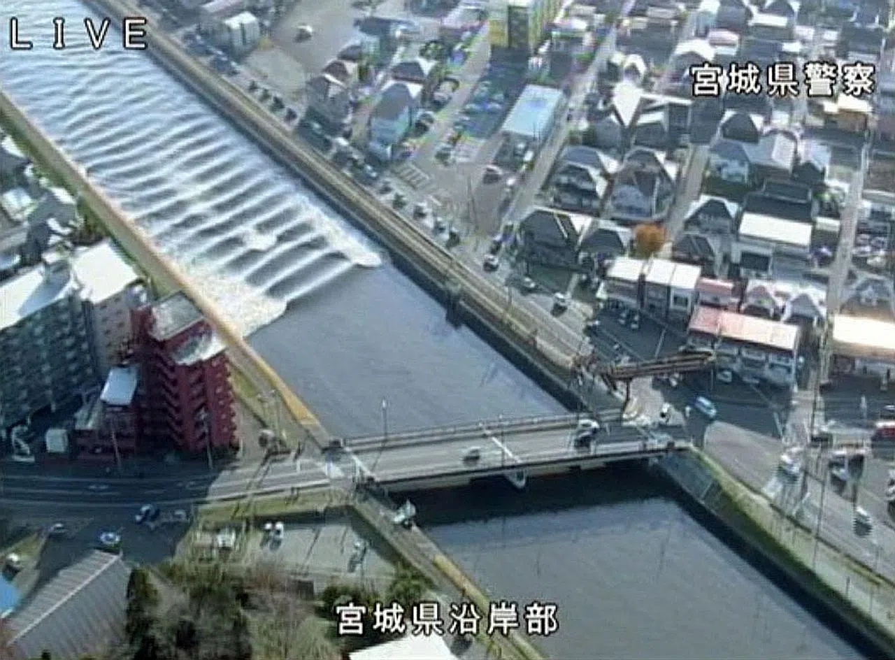 A tidal surge is seen in Sunaoshi River after tsunami advisories were issued following an earthquake in Tagajo, Miyagi prefecture, Japan November 22, 2016, in this video grab image released by Miyagi Prefectural Police via Kyodo.