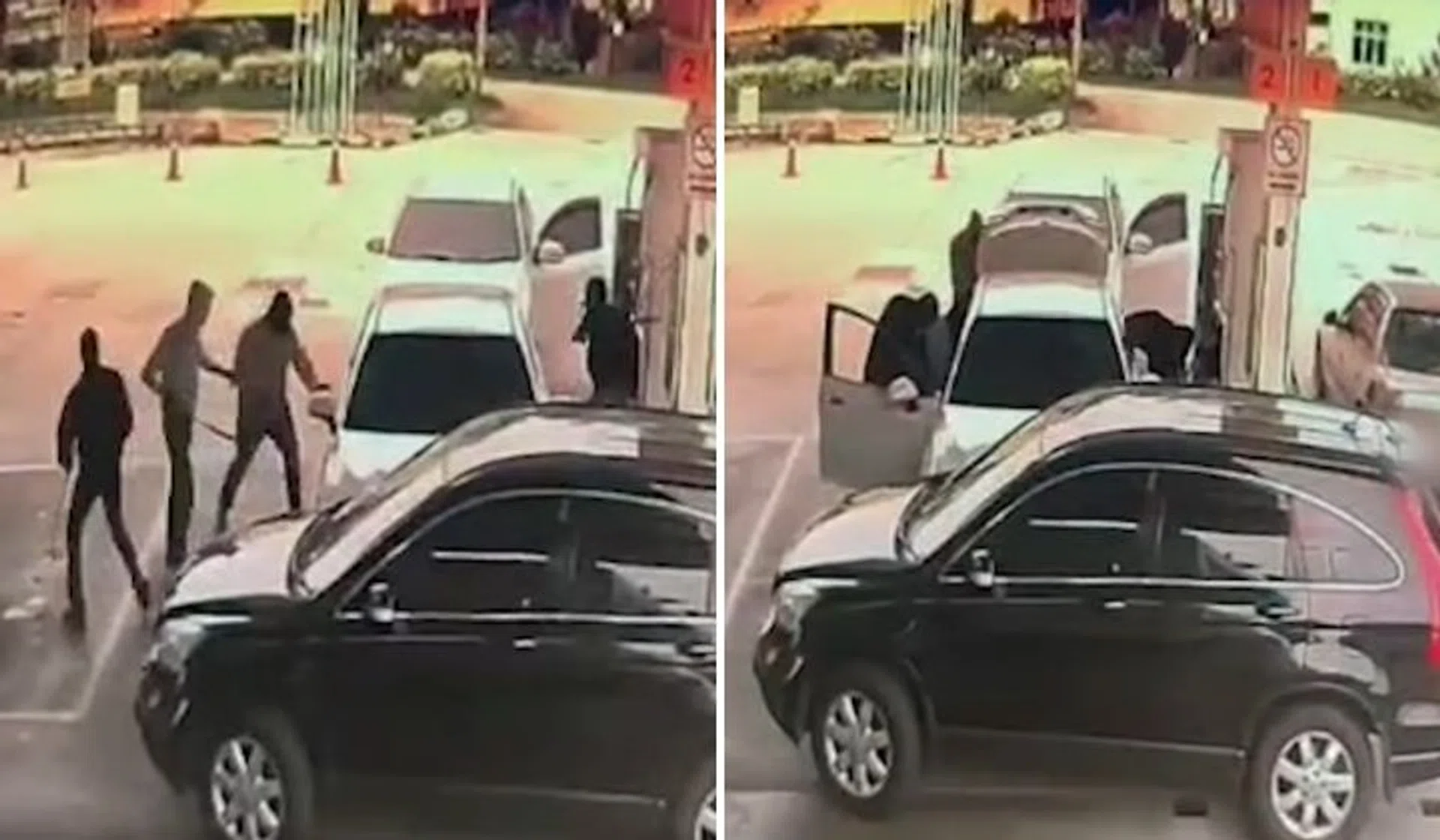 In closed-circuit television footage, five robbers can be seen using what appears to be either a crowbar or parang to smash the victim's car windows. The victim then tries in vain to get away by reversing into the Honda.