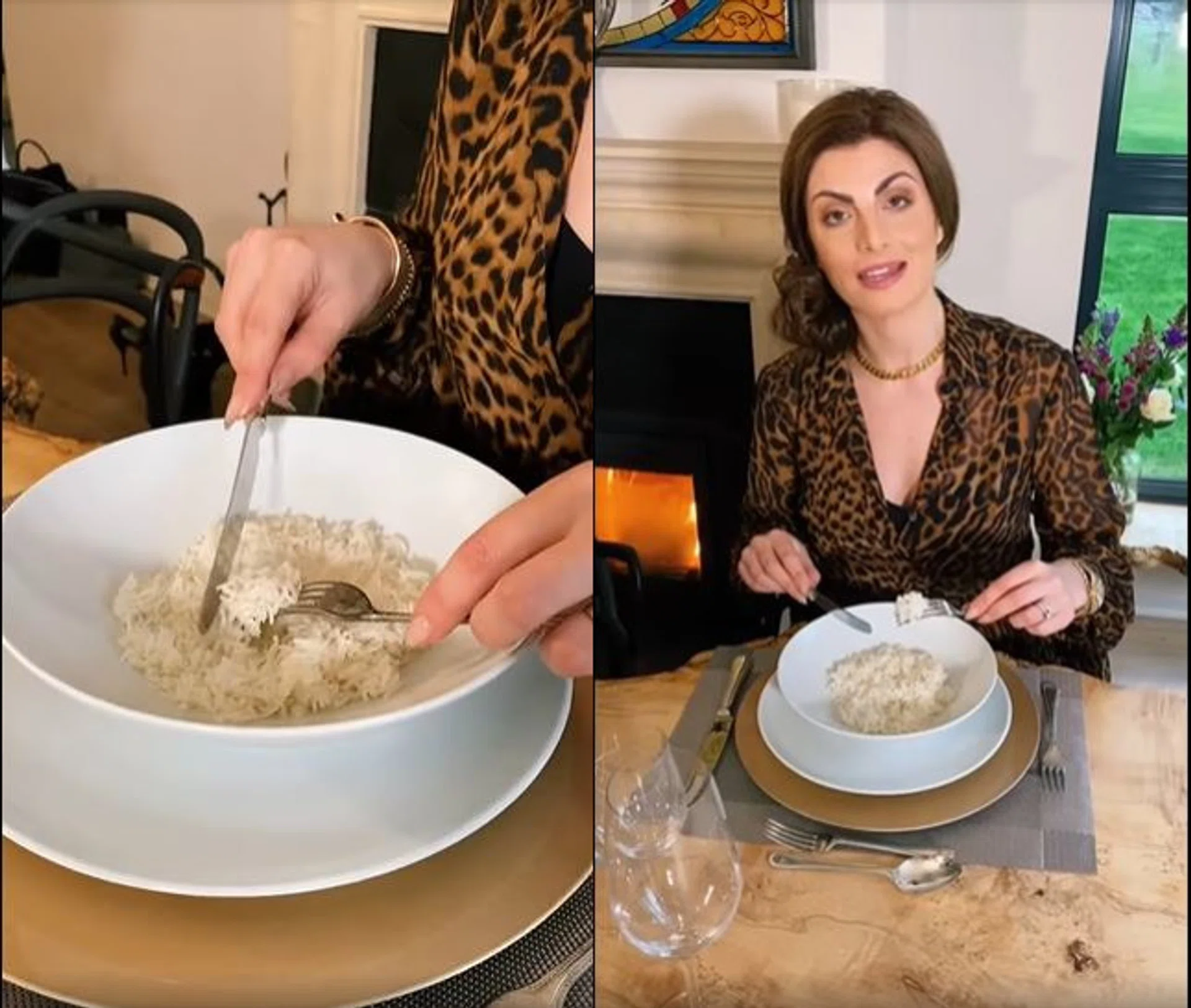 She advises viewers not to shovel the rice into the mouth using the fork like a spoon.