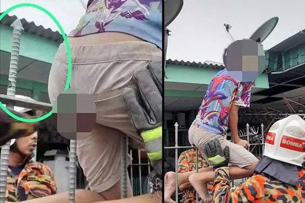 A Malaysian boy had his buttocks impaled by a spike after he slipped while climbing the metal fence of his house.