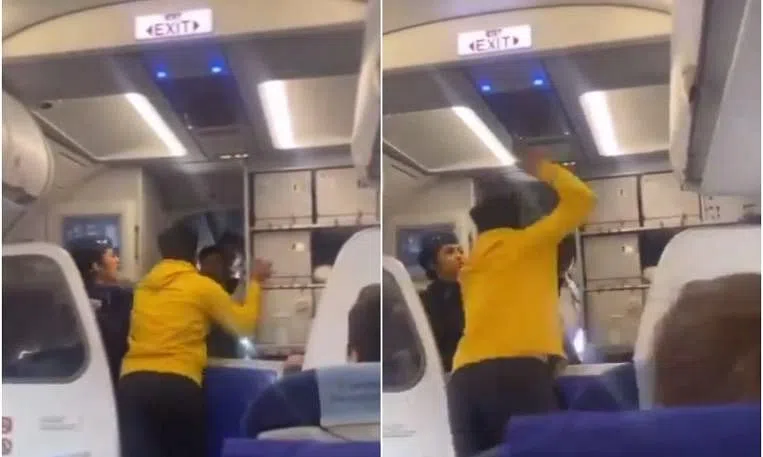 Another passenger in a blue hoodie is seen stopping the aggressor, calming him and walking with him off frame.