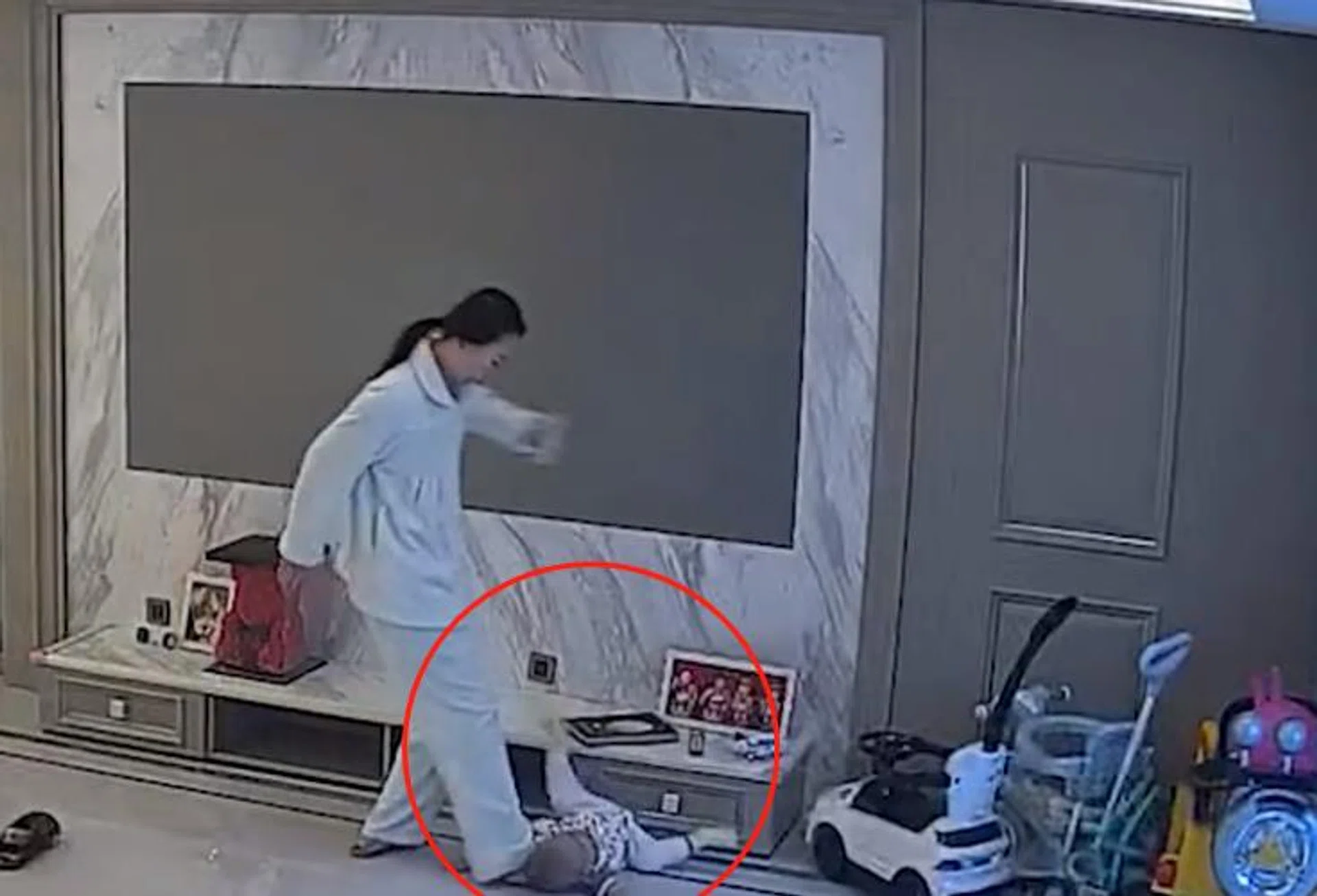After saving her son, the mother does not pick him up and appears to talk to the young child, who looks up at Ms Zuo while lying on her foot before rolling onto his stomach to continue playing.