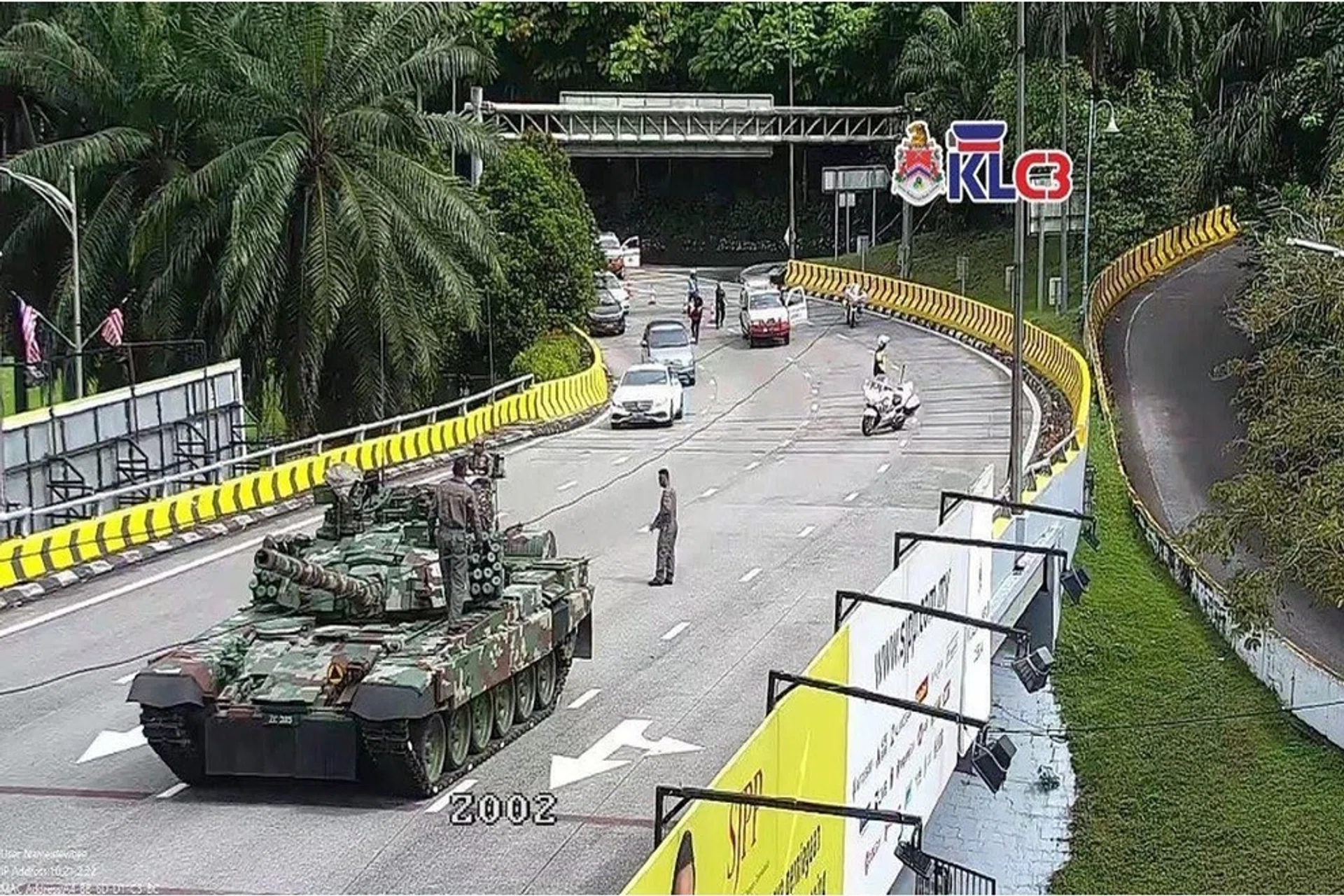 Like a scene out of a video game, a tank breaks down in the middle of Kuala Lumpur traffic