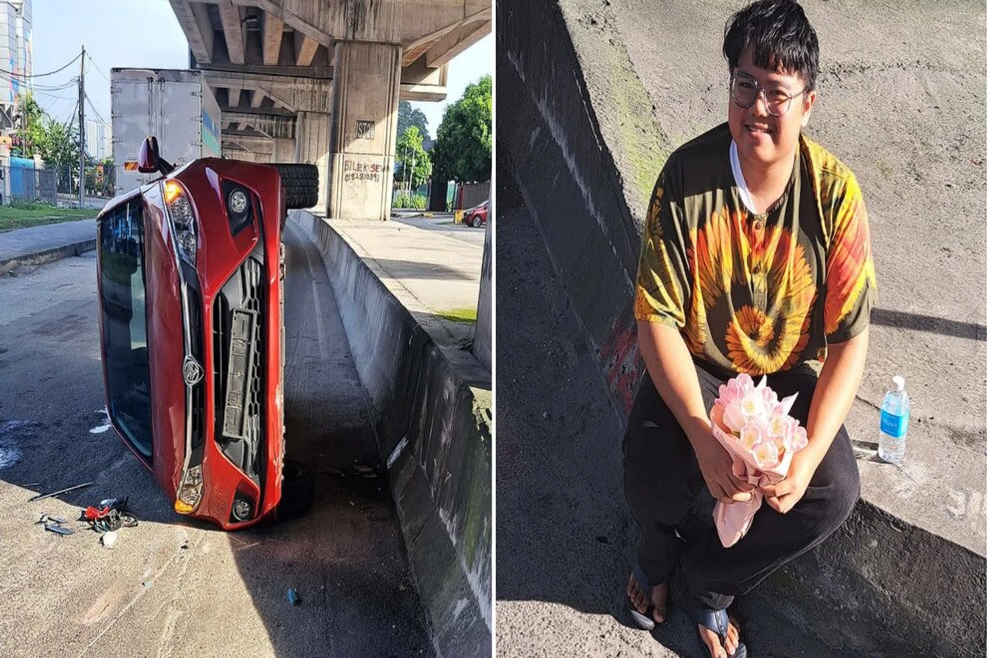 He said he passed by the scene of the accident on Sunday (July 16) and noticed that the car in front of him had been hit by a sedan, overturning as a result.