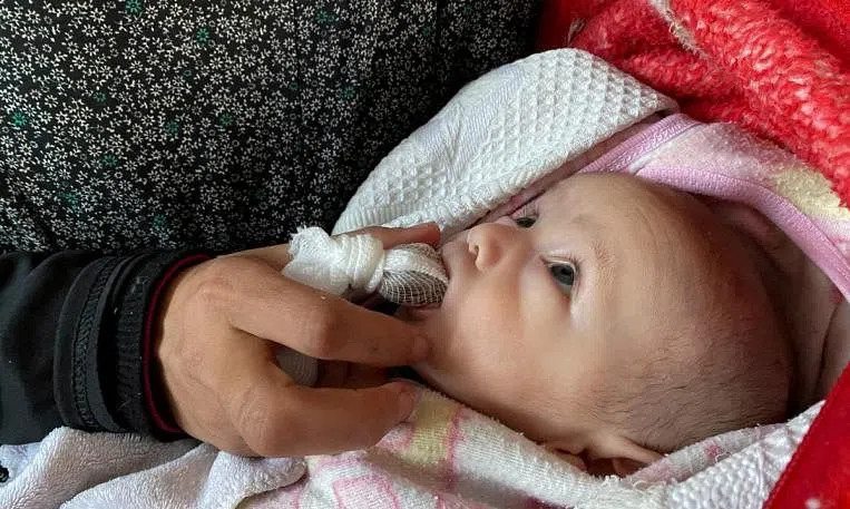 At Al-Nuseirat refugee camp, just north of Deir al-Balah, Warda Mattar, a displaced mother sheltering in a school with her two-month-old baby, was giving him a date wrapped in gauze to suck on, for lack of any milk.