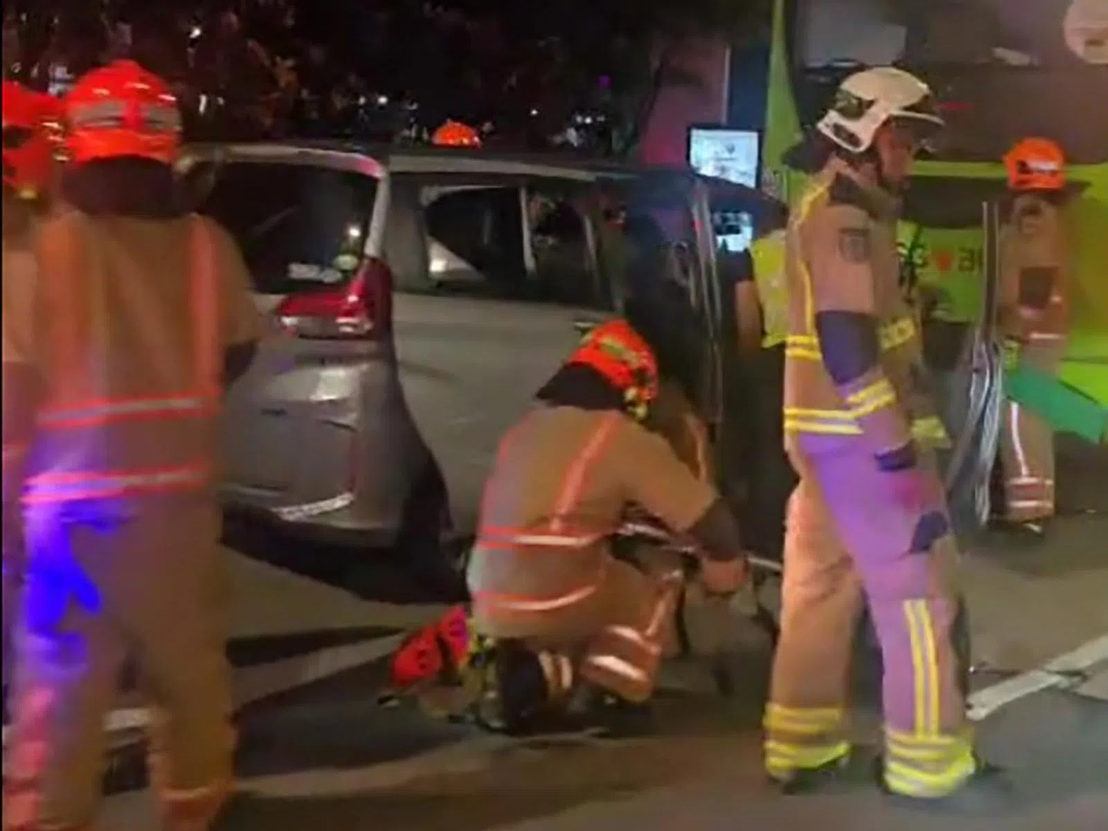 In a photo of the accident, a silver car is seen at the rear of a Tower Transit bus, with its windows shattered and its right-side doors left ajar as SCDF officers attend to the emergency.