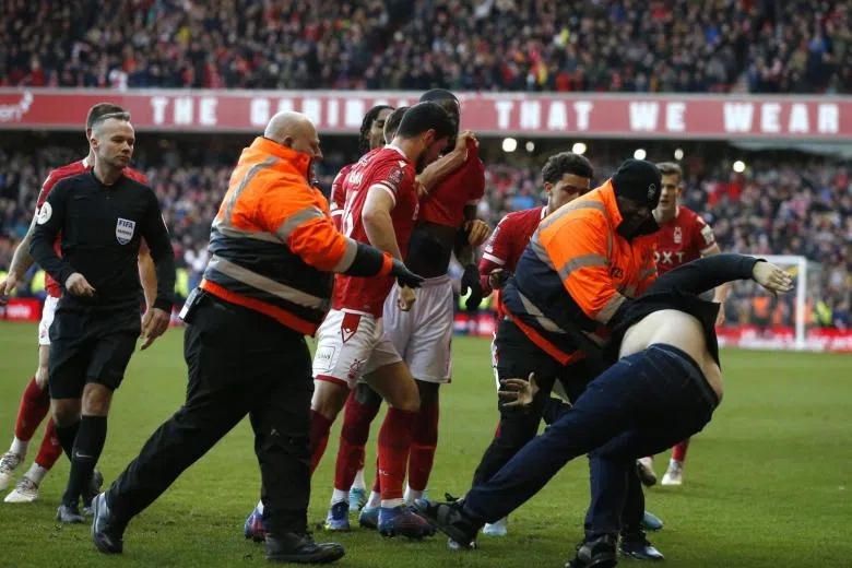 LONDON (AFP, REUTERS) - British police said a man has been arrested after a fan ran on to the pitch and attacked Nottingham Forest players celebrating a goal during their 4-1 FA Cup win against Leicester.