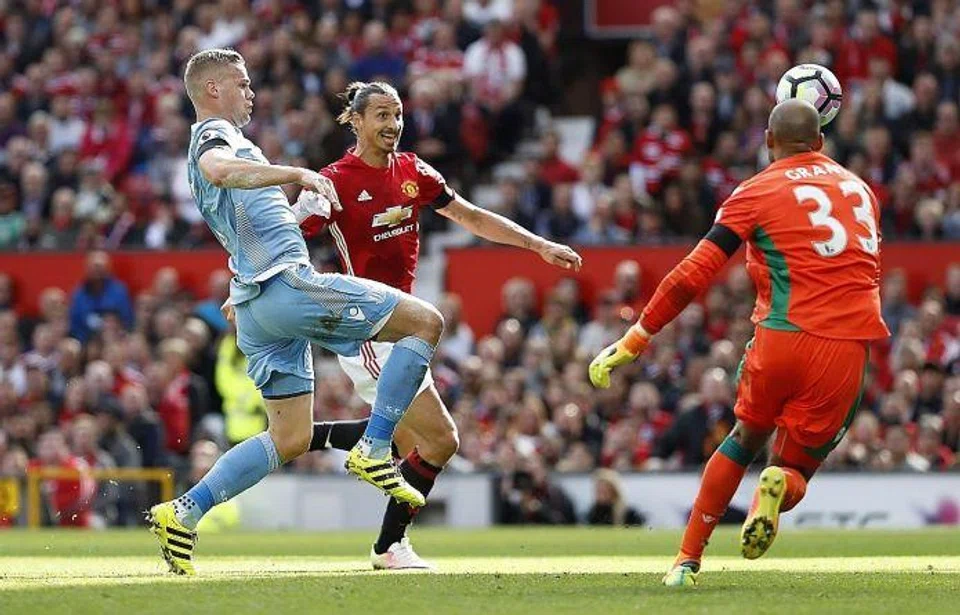 Stoke goalkeeper Lee Grant (No. 33) pulling off a magnificent save from Man United striker Zlatan Ibrahimovic (in red) in the third minute. PHOTO: REUTERS
