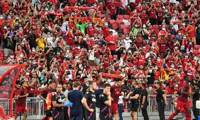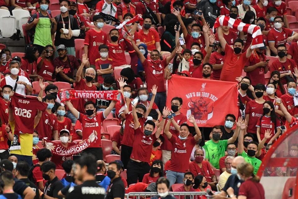 Decked out in jerseys, hats and scarfs, pockets of fans were heard singing the Liverpool anthem, You'll Never Walk Alone, along the Kallang River or chanting "Allez, Allez, Allez" at the OCBC Square two hours before the 8.35pm start.