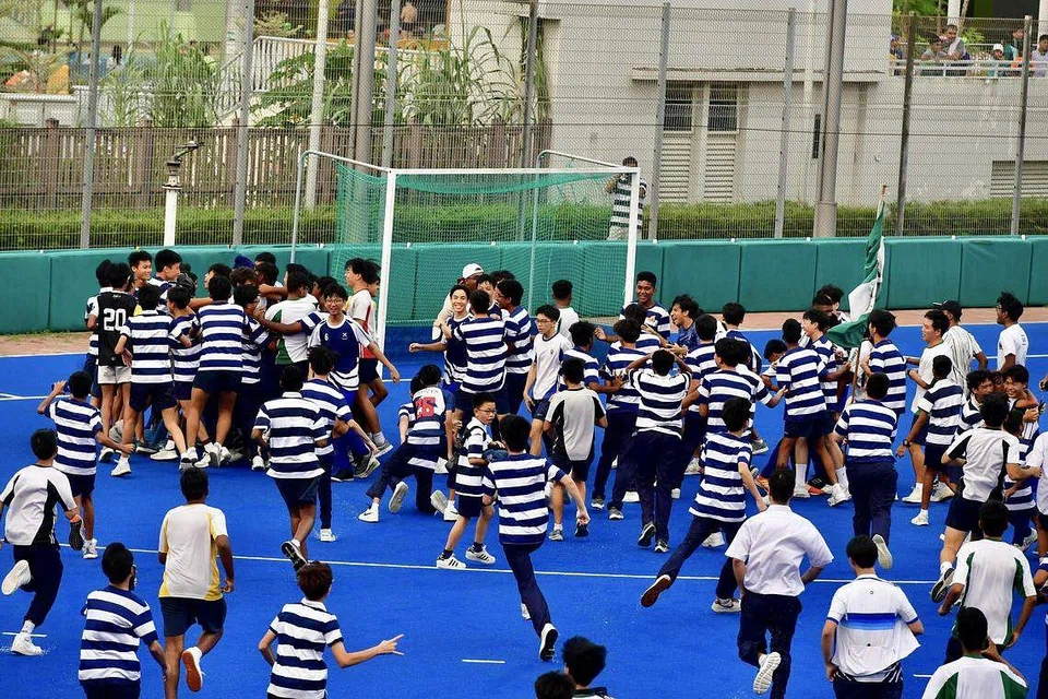 St Andrew's Secondary School captain S. Ahilan was hoisted into the air by his schoolmates as shouts of "MVP" (Most Valuable Player) rang out at the Sengkang Hockey Stadium.
